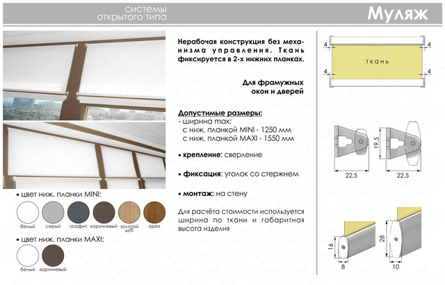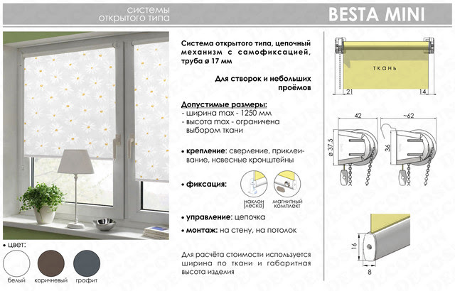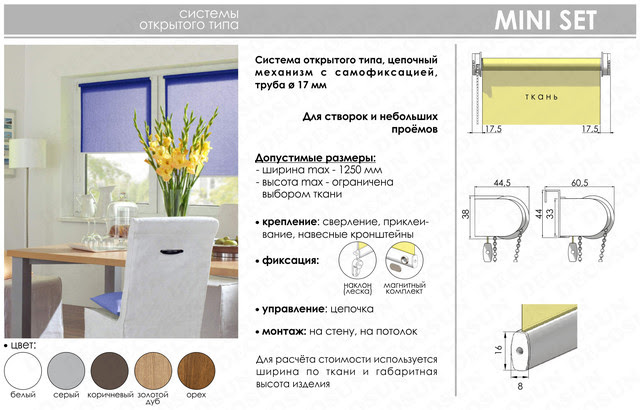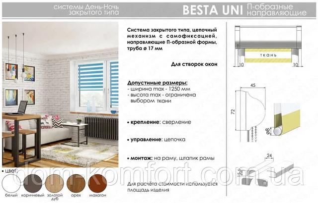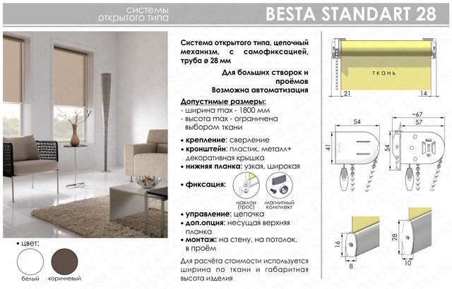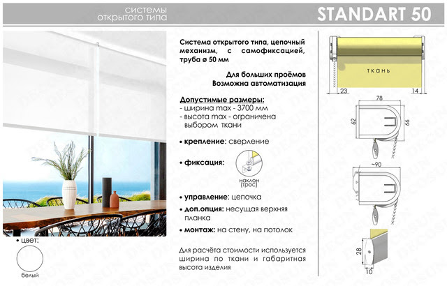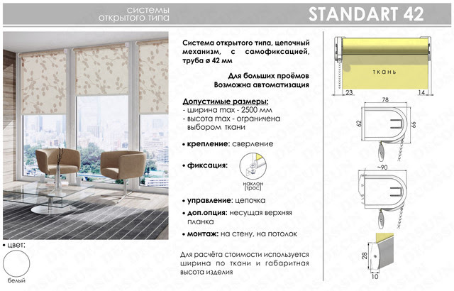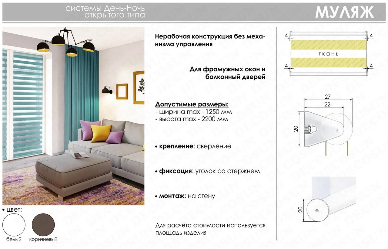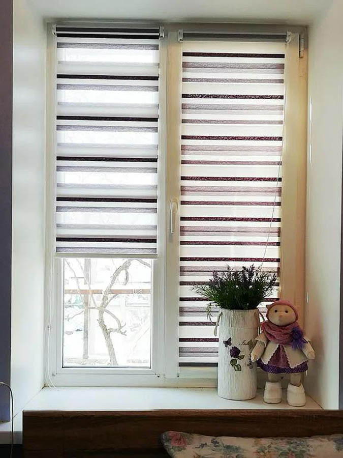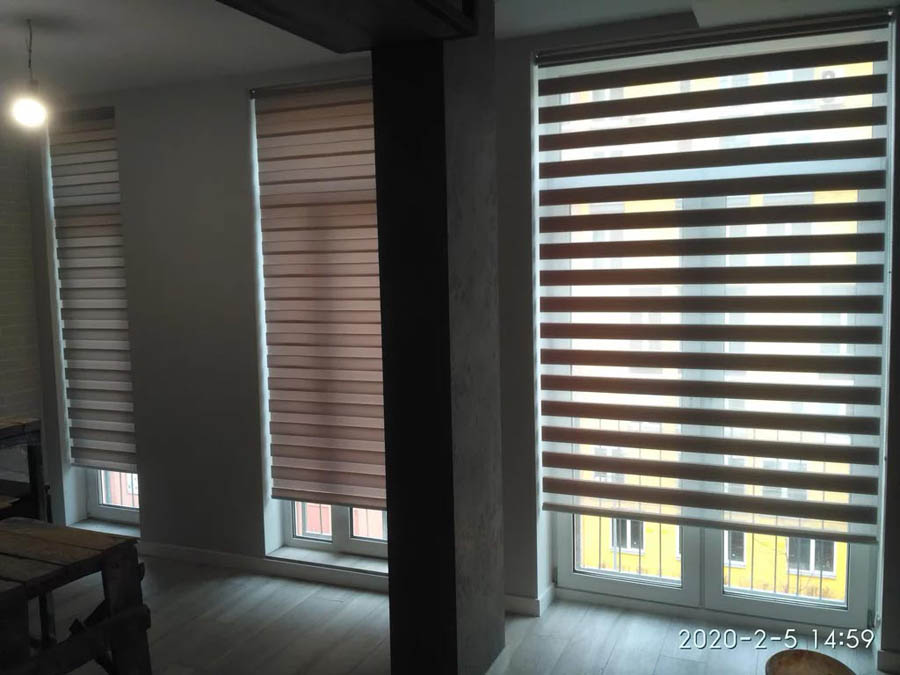 Ролеты день ночь открытого типа это базовая и наиболее продаваемая модель. Выбирая ролеты день ночь основная сложность это цвет и материал ткани. Их различают за плотностью и фактурой это относится как плотным линиям, так и прозрачным. Если Ваши окна выходят на солнечную сторону и сильный световой поток на протяжение всего дня. Если этот свет Вам сильно мешает, тогда лучше более плотную ткань. Если свет не постоянный, тогда можно рассмотреть ткани в средних тонах. Шторы день ночь не пропускают прямые лучи, свет от фонарей приламляя его, скрывают Вас от прохожих и посторонних взглядов от соседей. Подбор цвета лучше осуществлять на месте (дом, квартира, офис, студия) только в таком случае Вы увидите как цвет раскроется в Вашем помещение. Шторы день ночь обеспечивает дополнительный свободный обзор снаружи, визуальную защиту, комфорт и стиль.